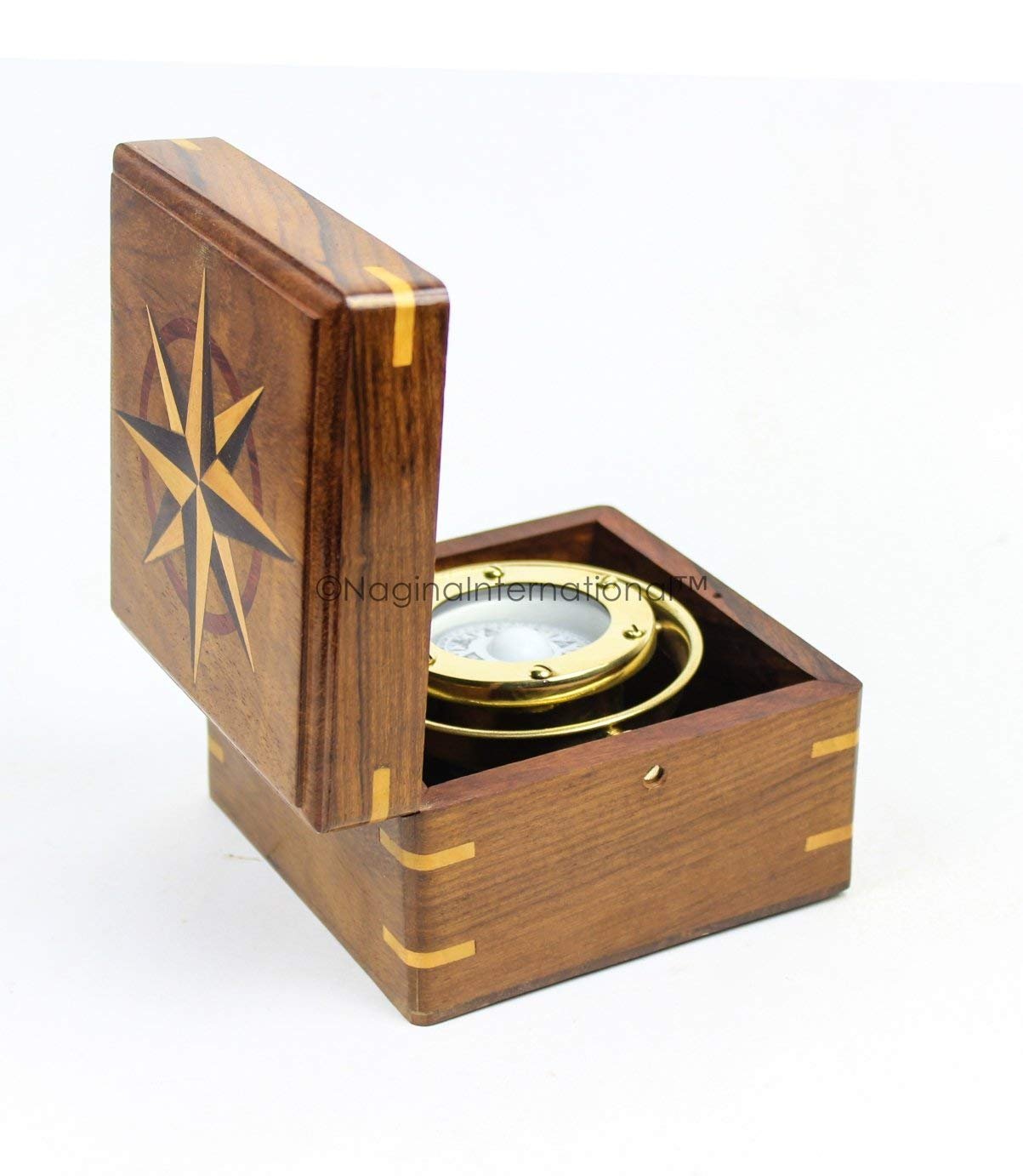 Nagina International Nautical Rosewood Cased Brass Polished Gimbal Compass | Nautical Decor & Instruments