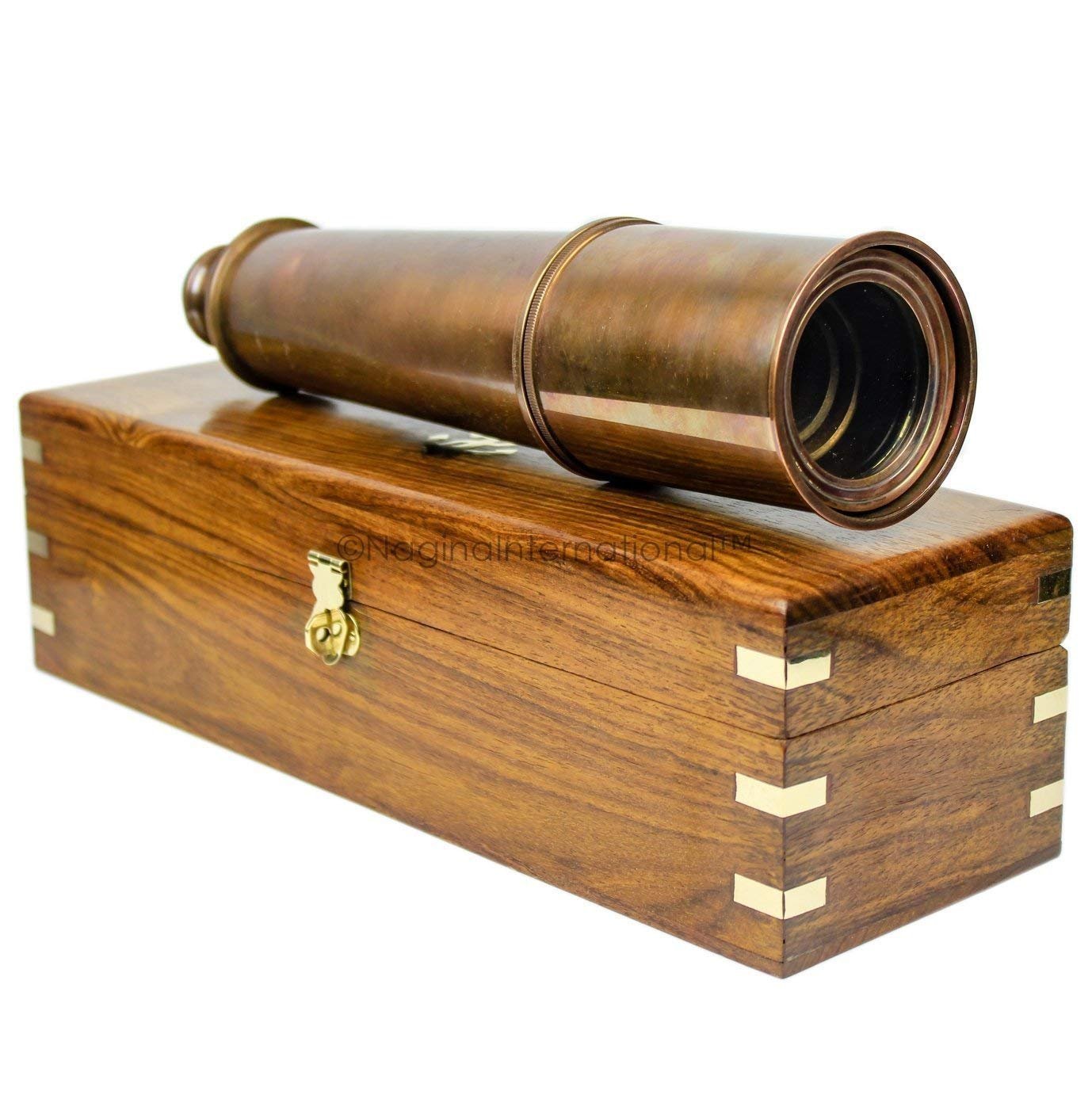 Nagina International Deluxe Nautical Pirate Boat Brass Spyglass with Functional Optical Zooms & Genuine Rosewood Storing Case Anchor Emblem Inlaid, Antique Copper