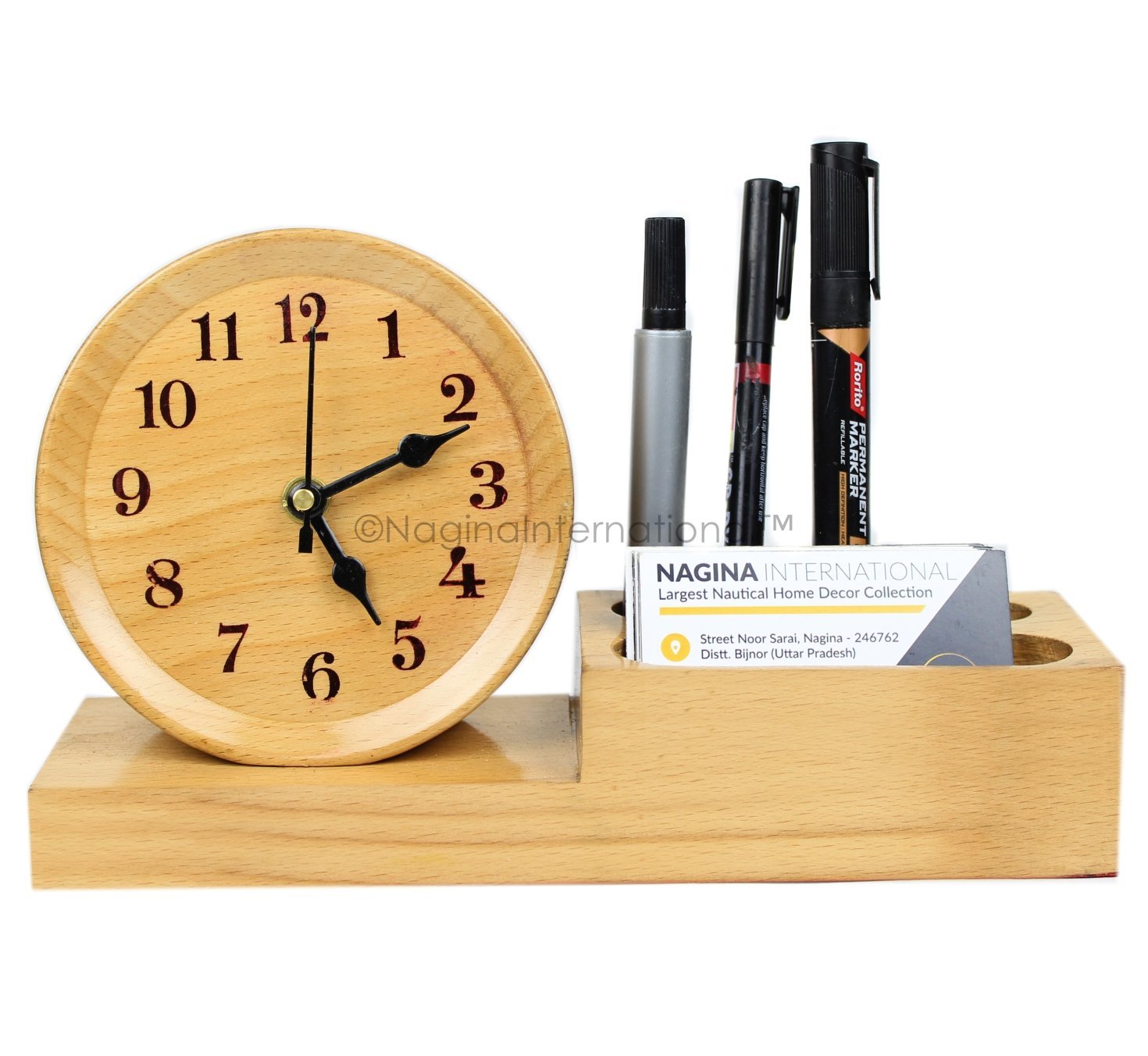 Nagina International Elegant Hand Crafted Wooden Steamed Beech Time’s Desk Clock with Pen & Business Visitors Card Holder | Office Decor Time’s Clock