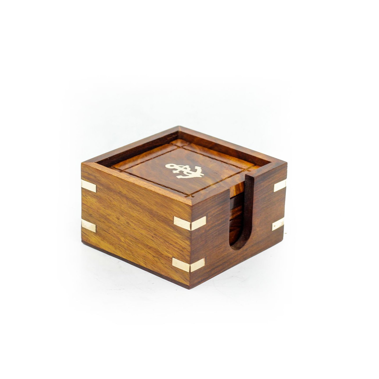 “Hampton Nautical Wooden Anchor Coasters with Rosewood Holder (Set of 6), Brown, 3″””